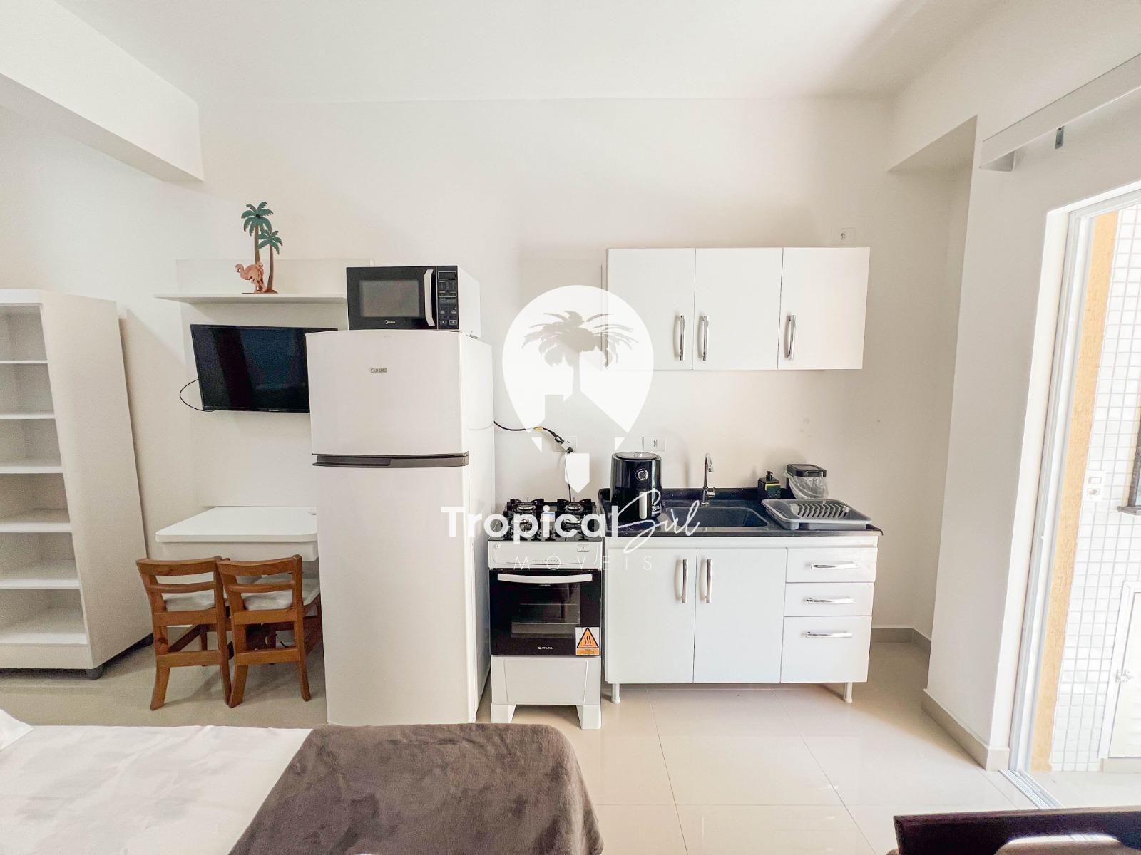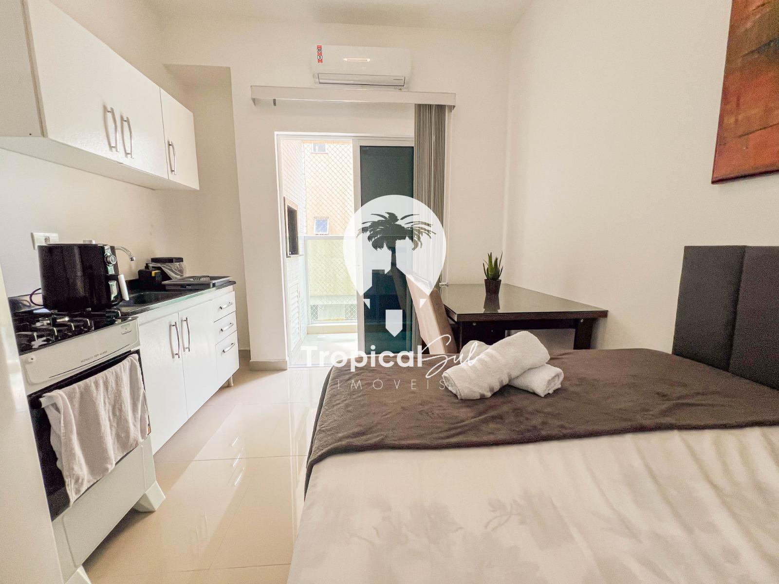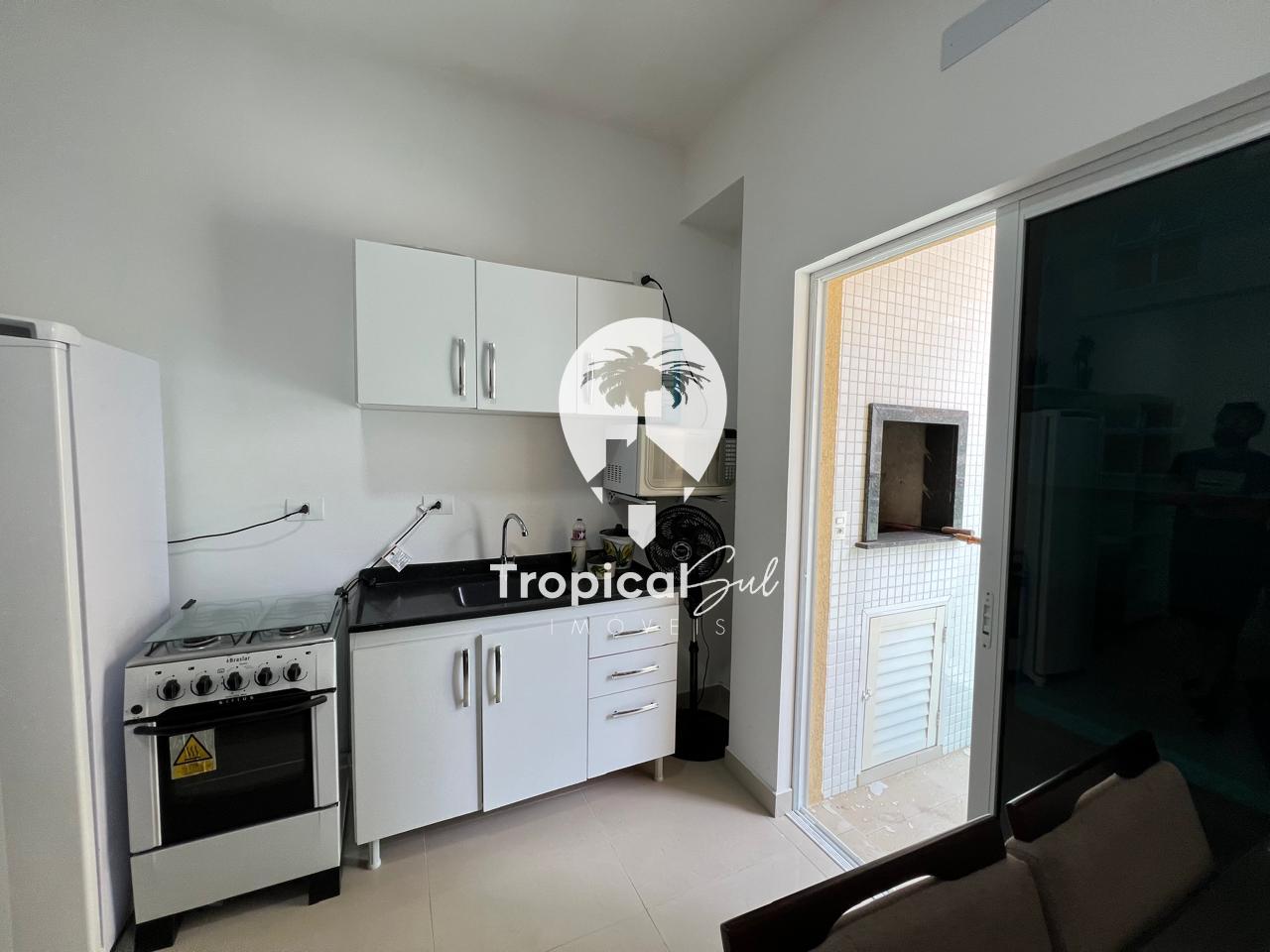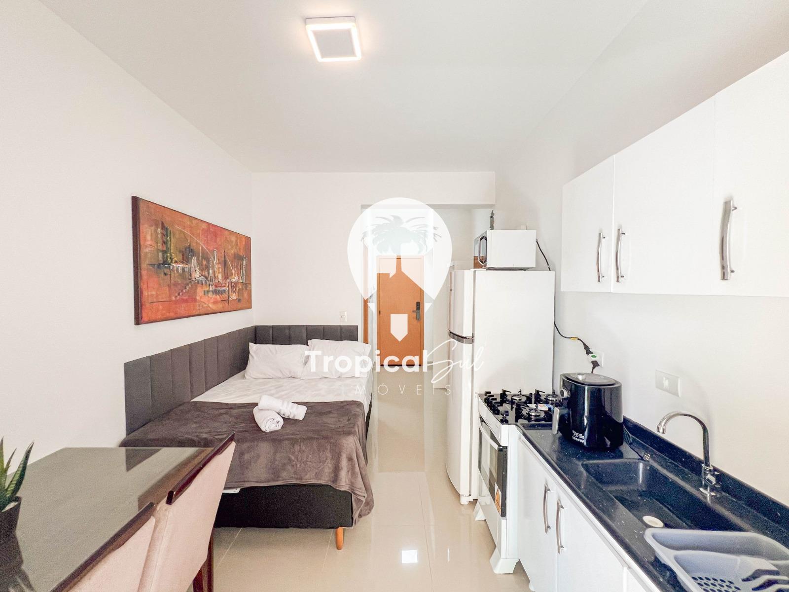 Dormitório, banheiro social, sala, cozinha, integrados no mesmo ambiente, sacada com churrasqueira e vista frente para o mar.