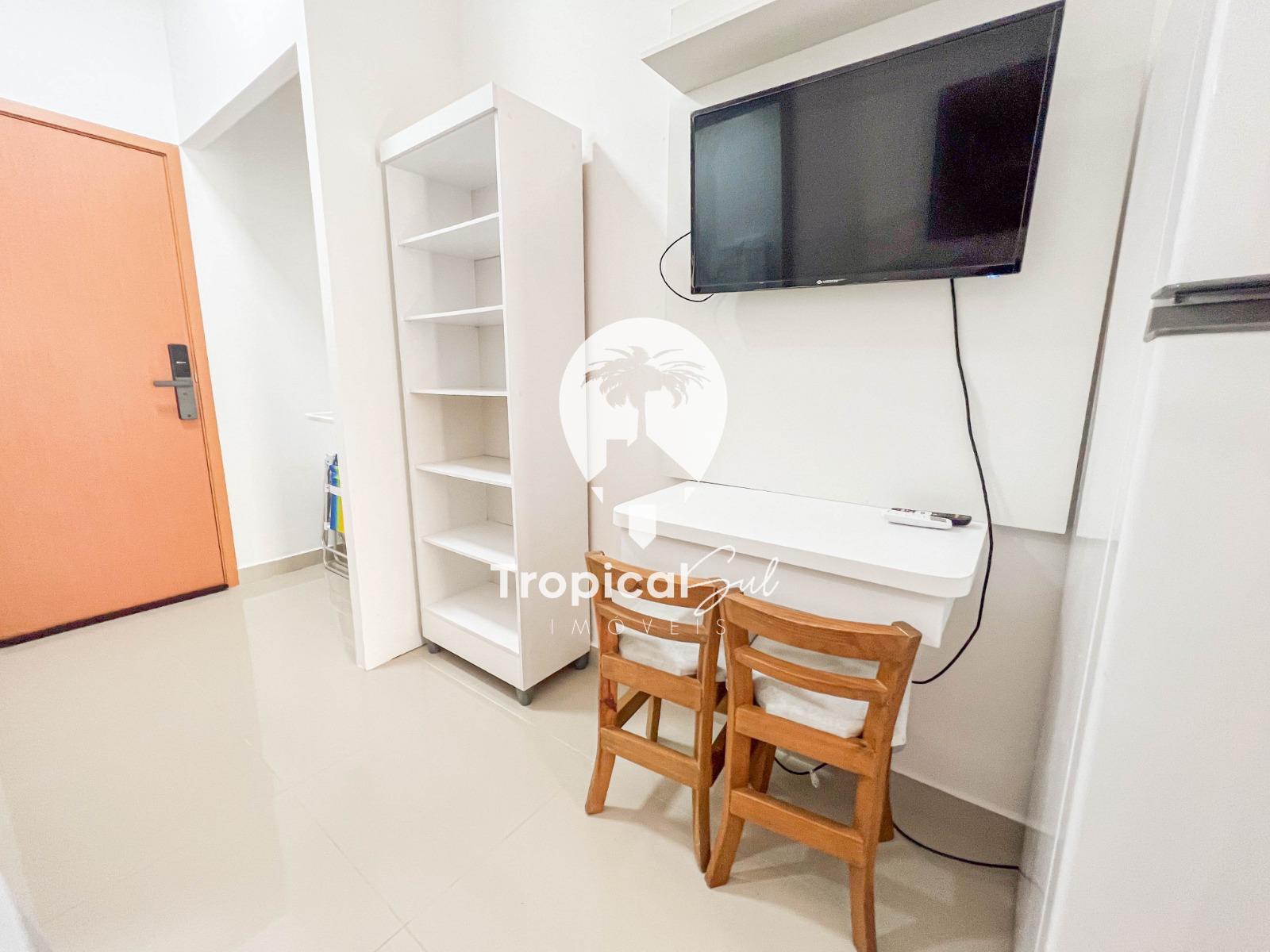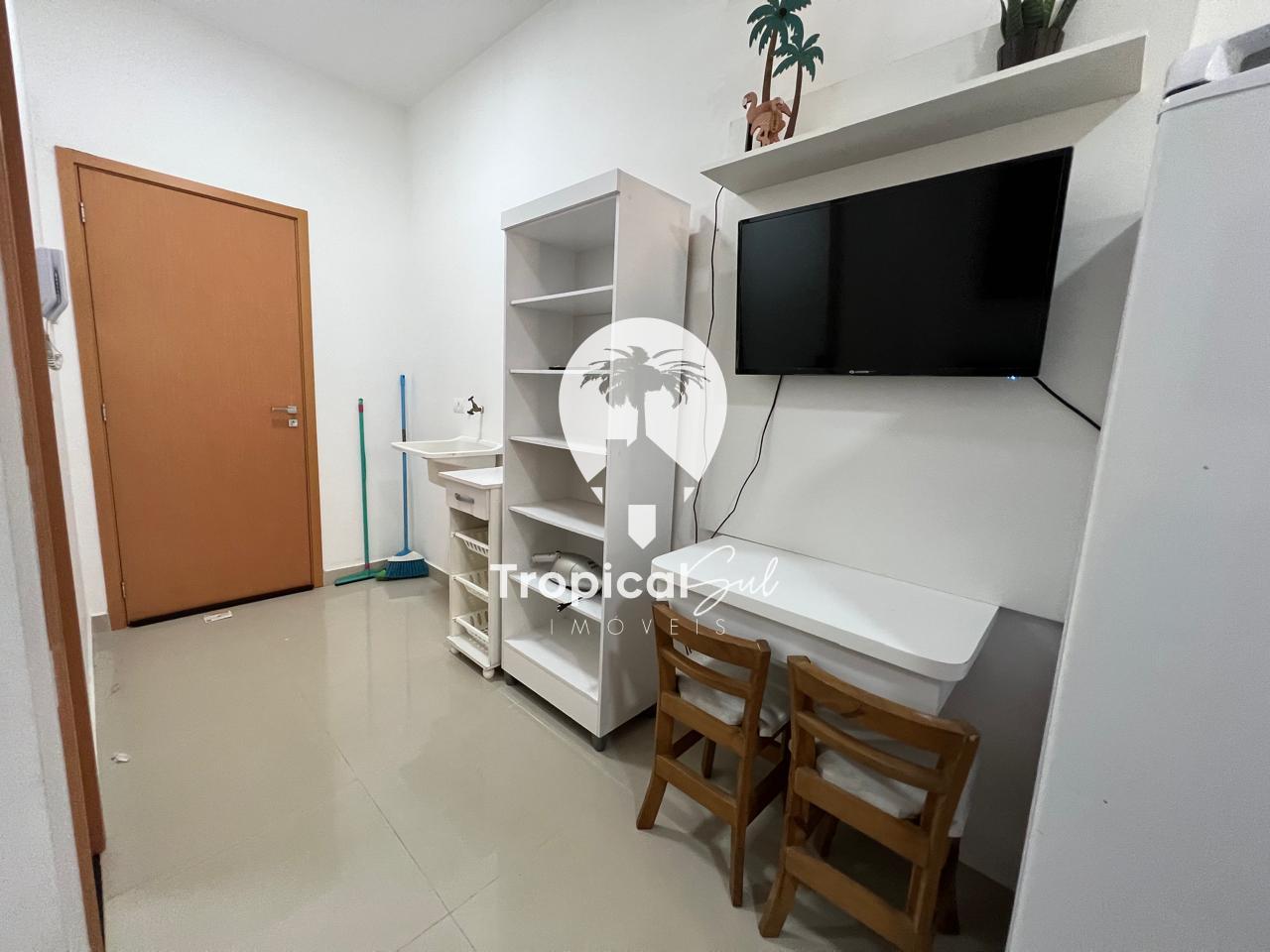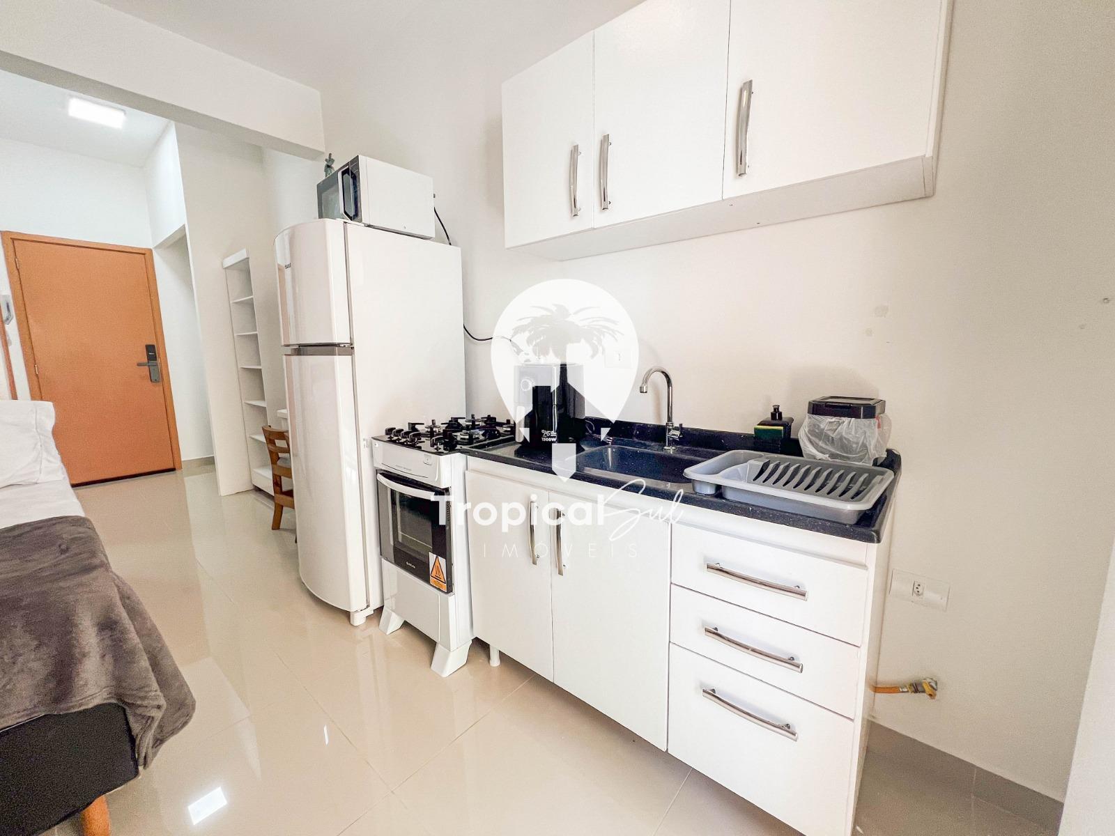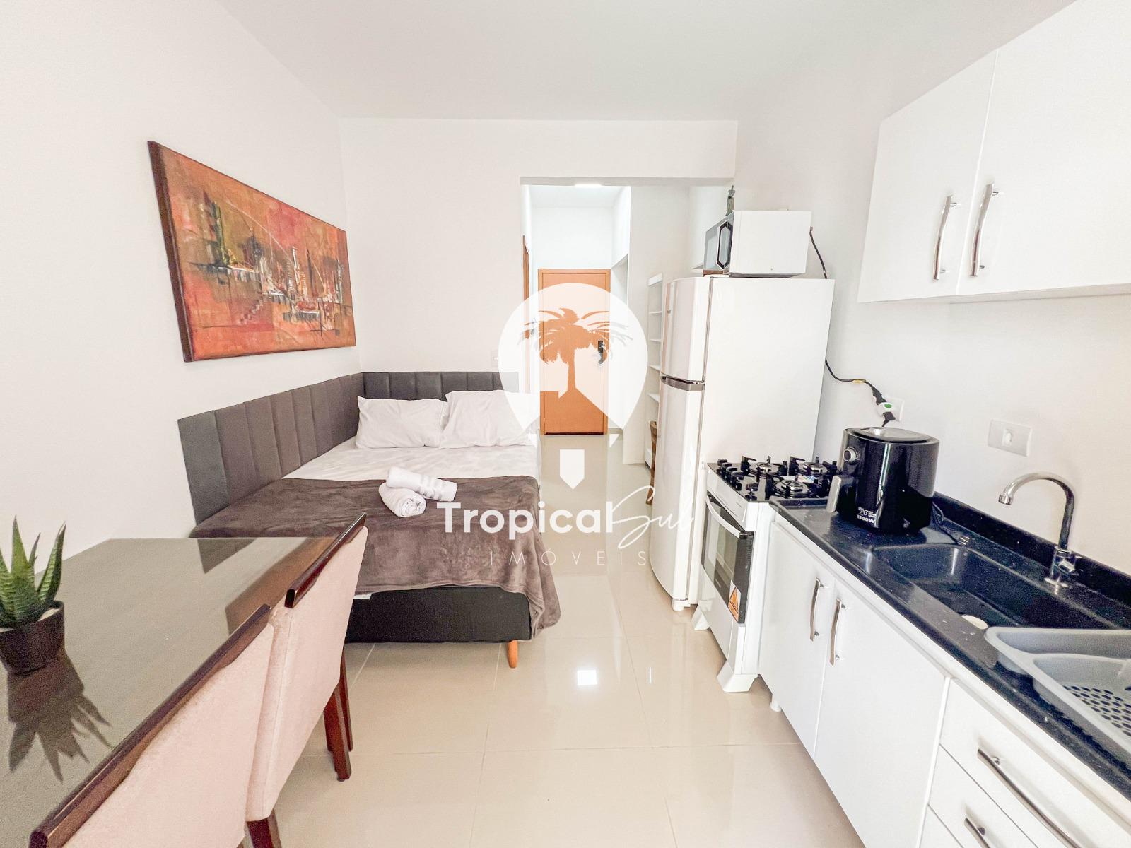 Dormitório, banheiro social, sala, cozinha, integrados no mesmo ambiente, sacada com churrasqueira e vista frente para o mar.