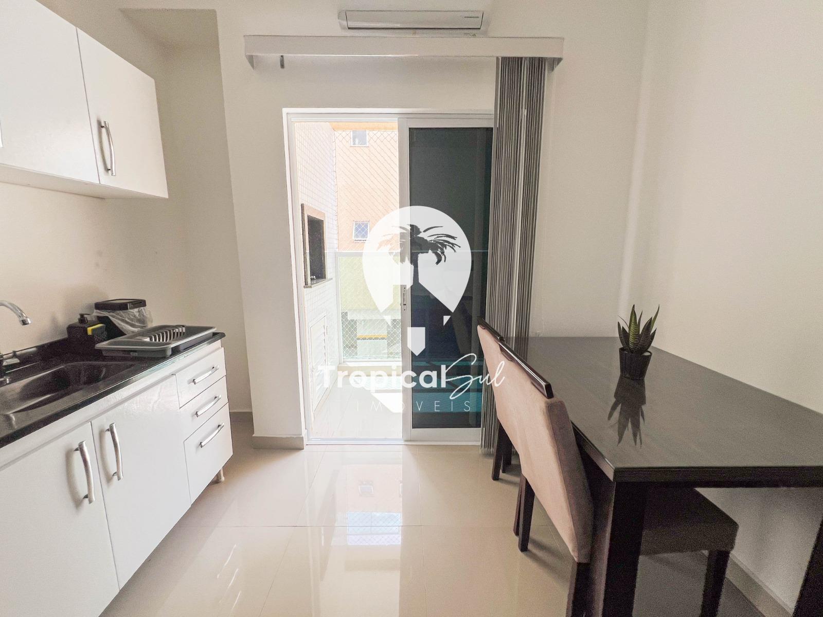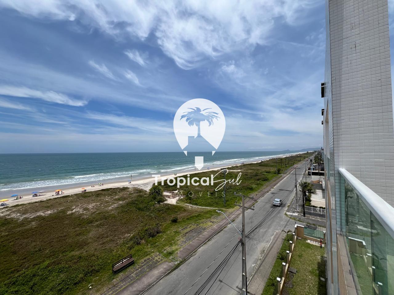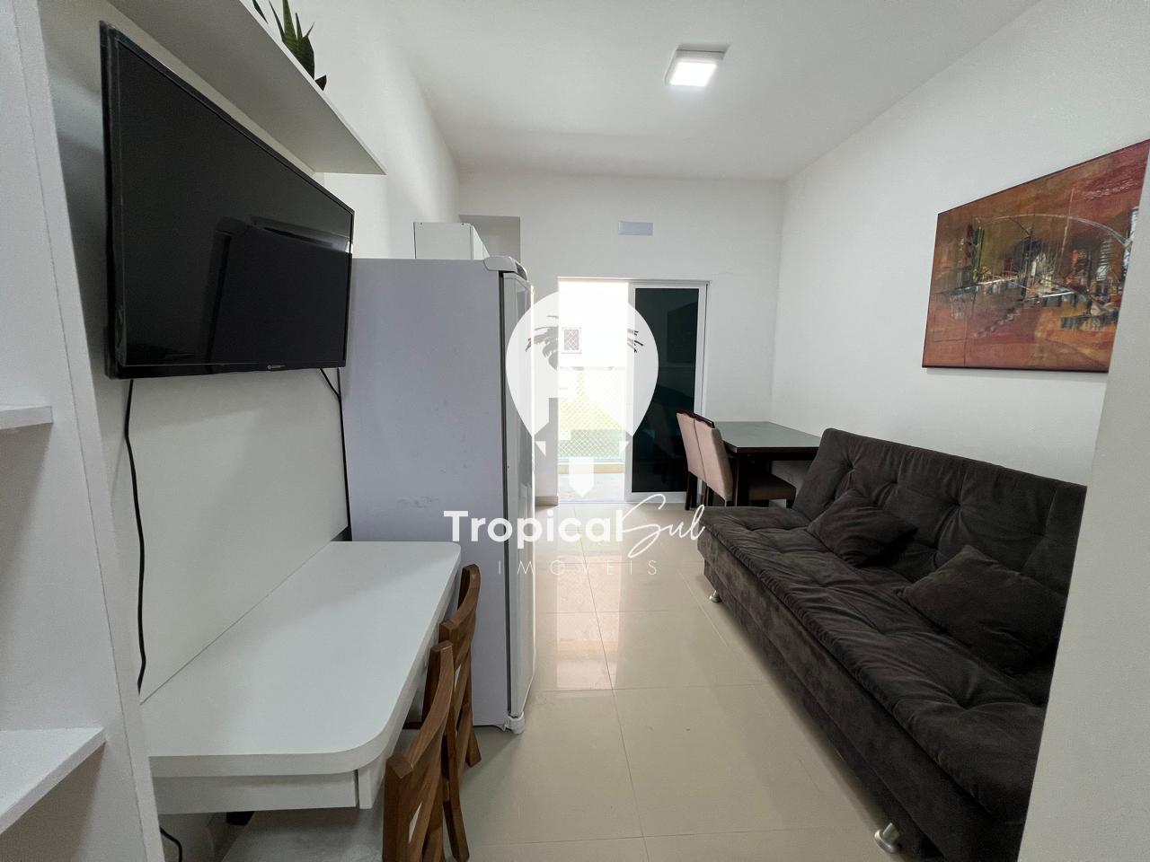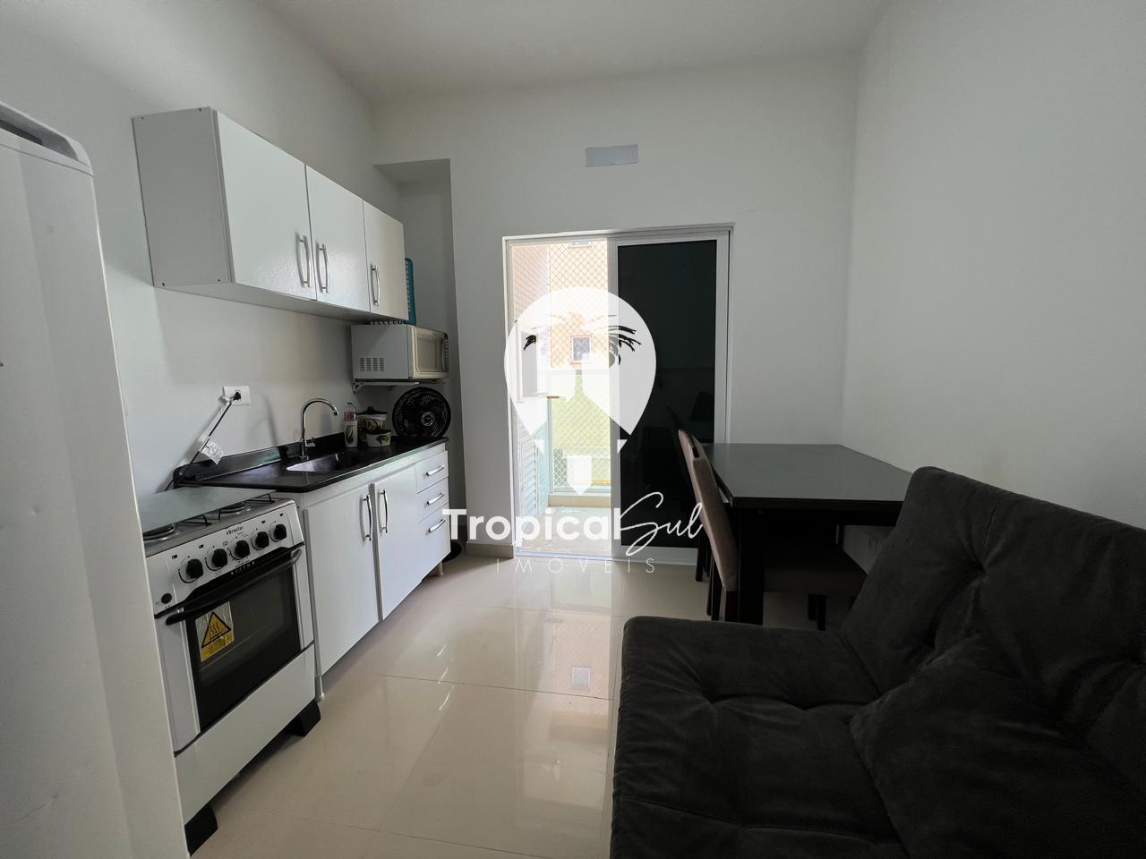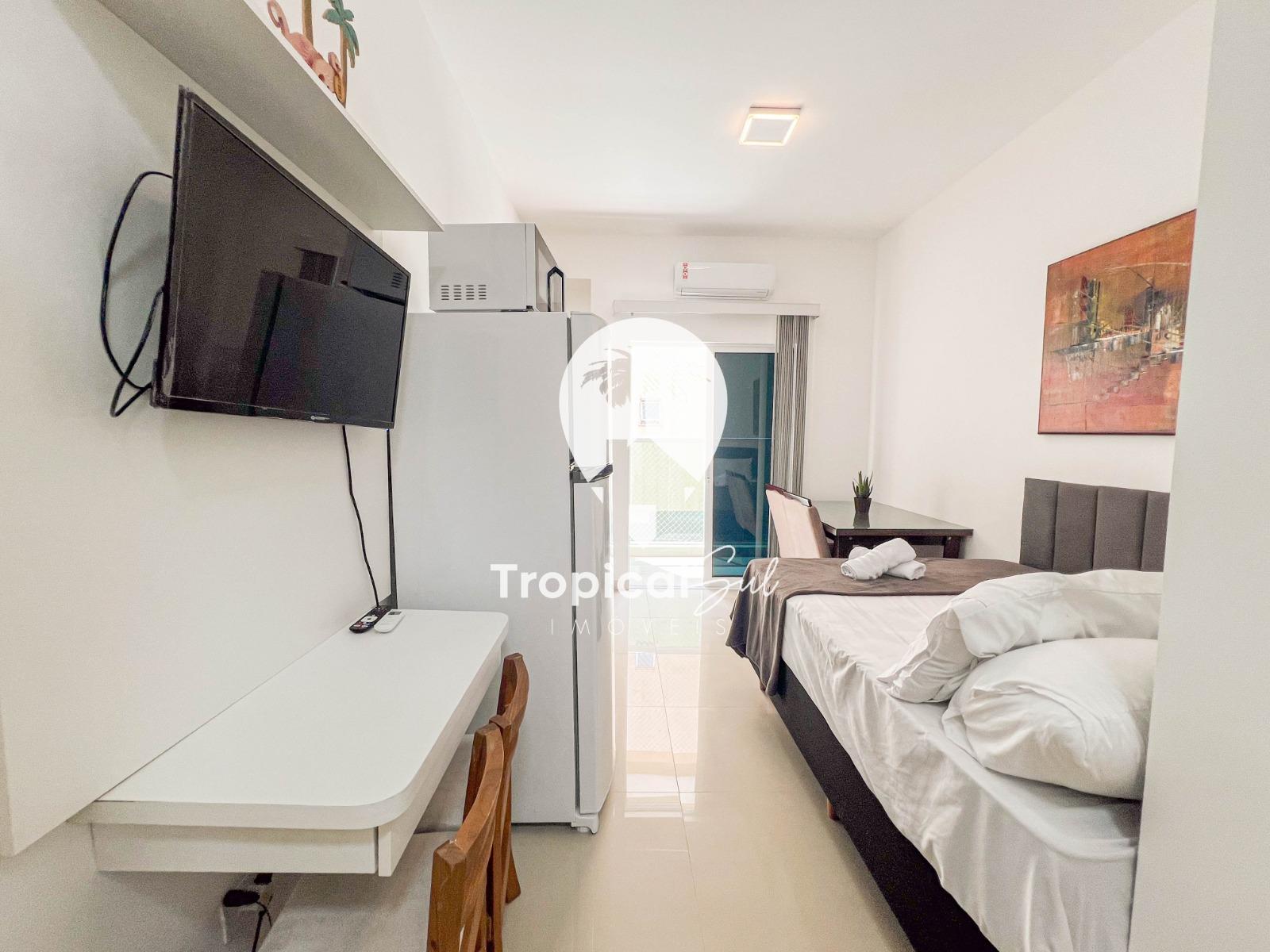 Dormitório, banheiro social, sala, cozinha, integrados no mesmo ambiente, sacada com churrasqueira e vista frente para o mar.