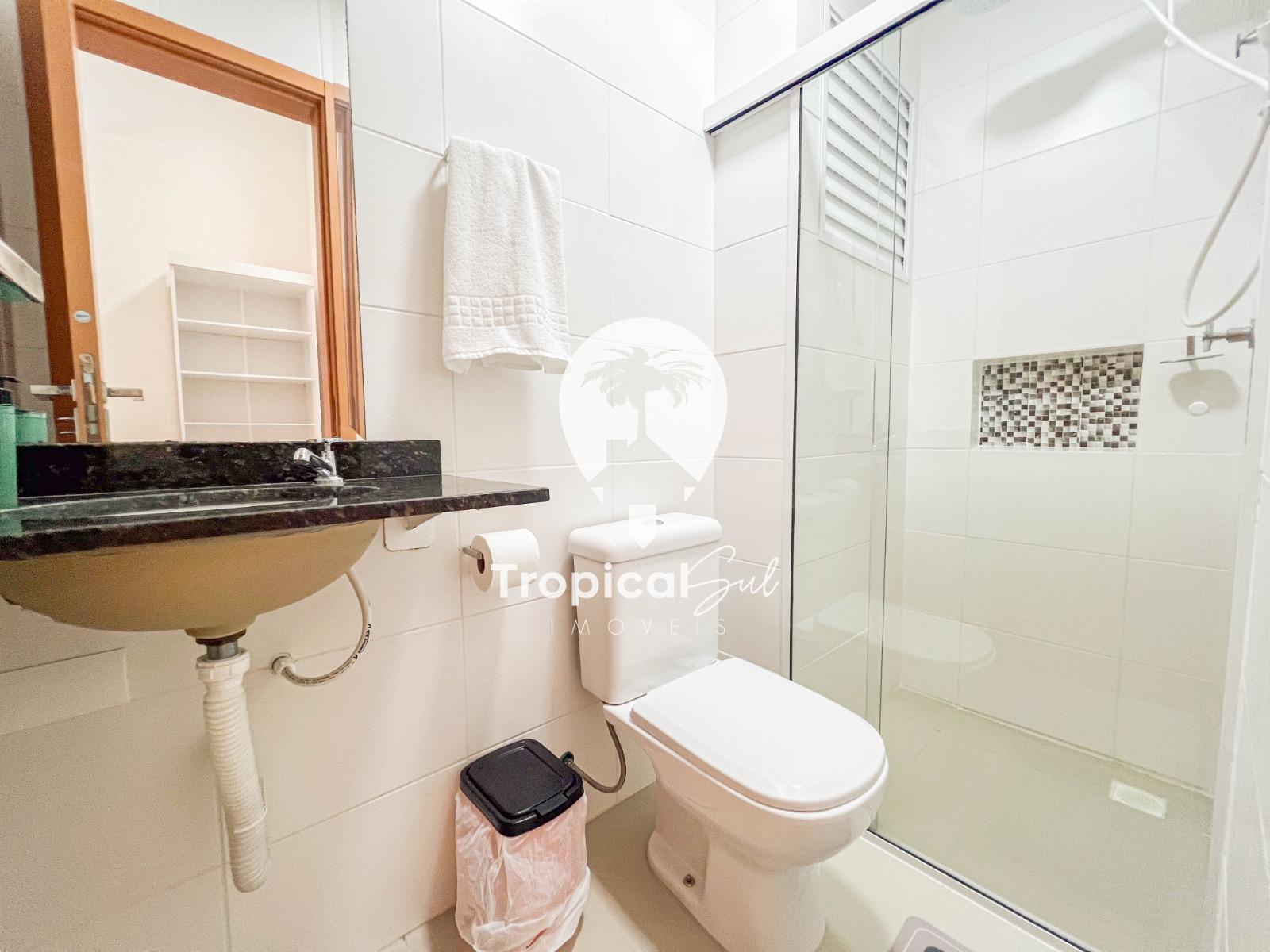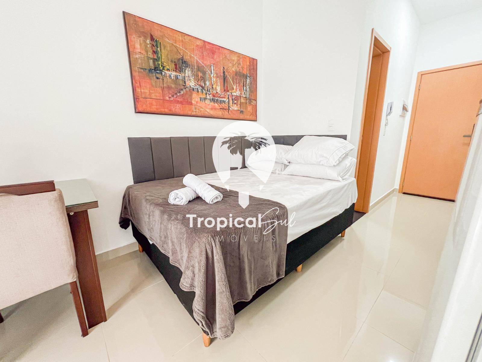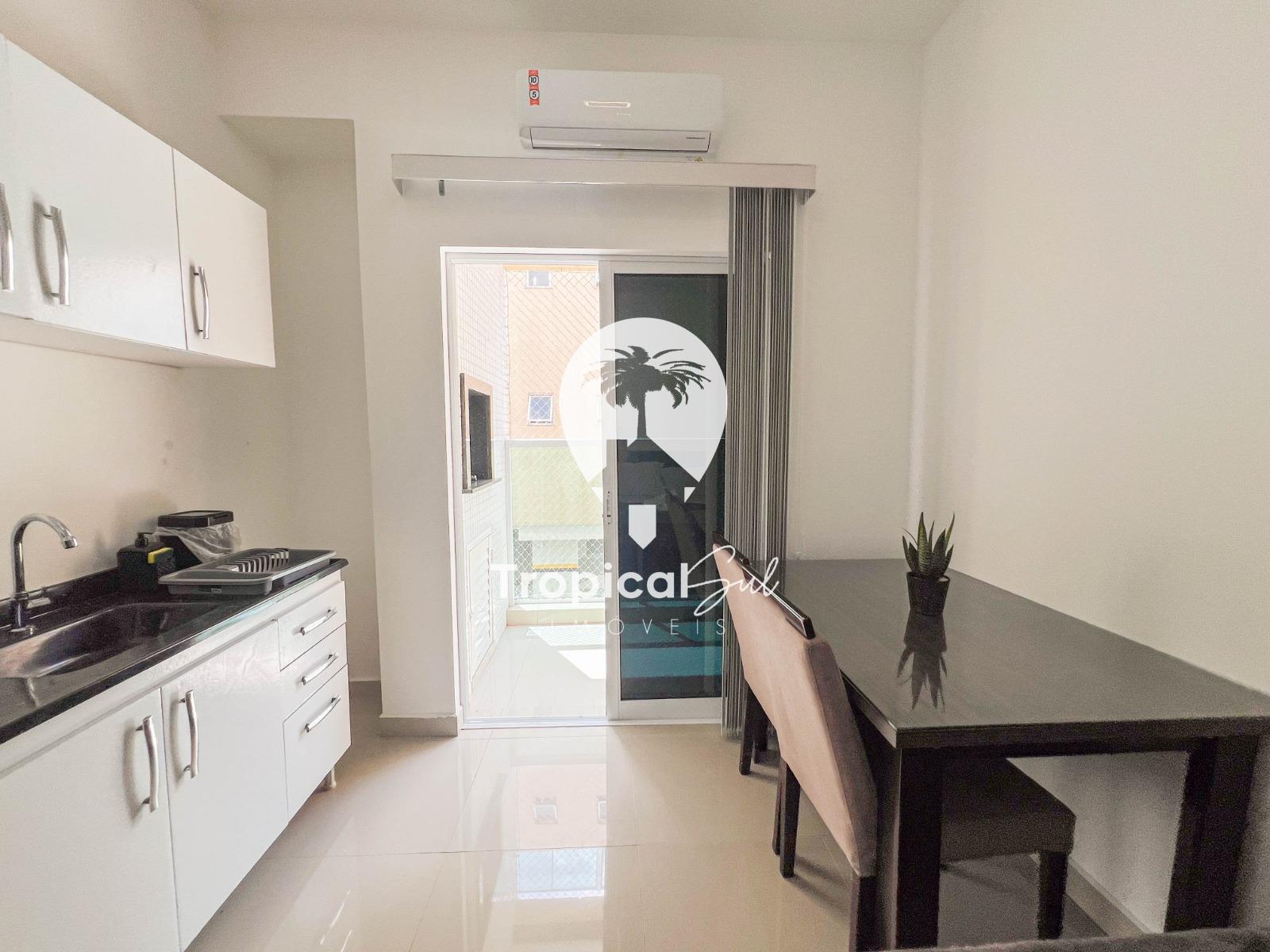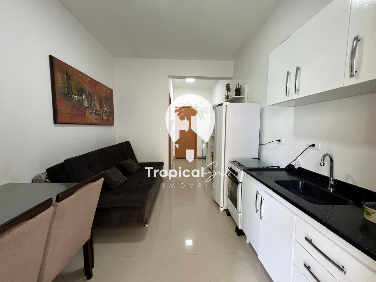 Dormitório, banheiro social, sala, cozinha, integrados no mesmo ambiente, sacada com churrasqueira e vista frente para o mar.